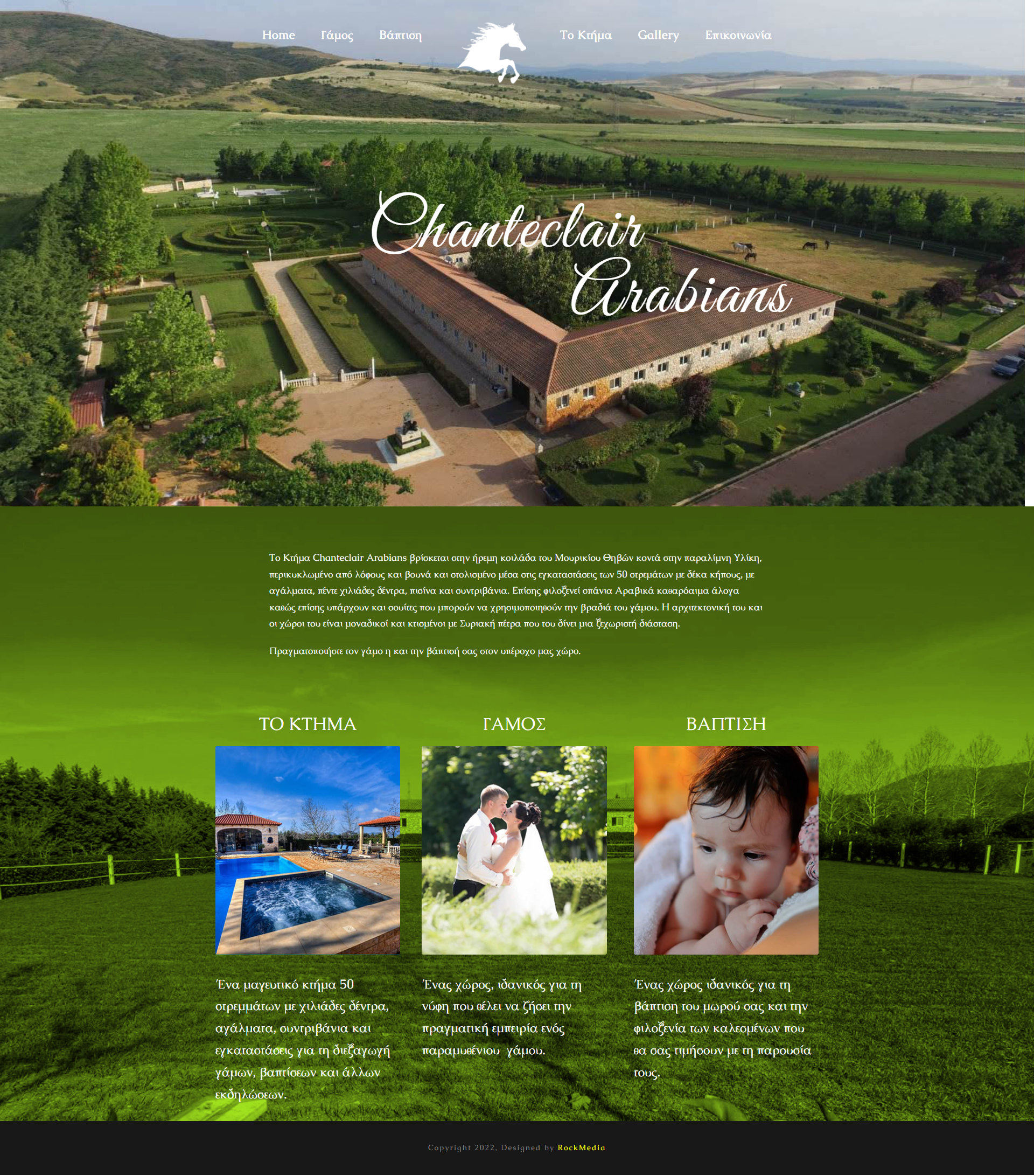 Πρόκειται για ένα Κτήμα κατάλληλο για γάμους βαπτίσεις και διεξαγωγή άλλων εκδηλώσεων. Για το σχεδιασμό του συγκεκριμένου ιστοτόπου δώσαμε προσοχή στην εικόνα και τη διαφήμιση.